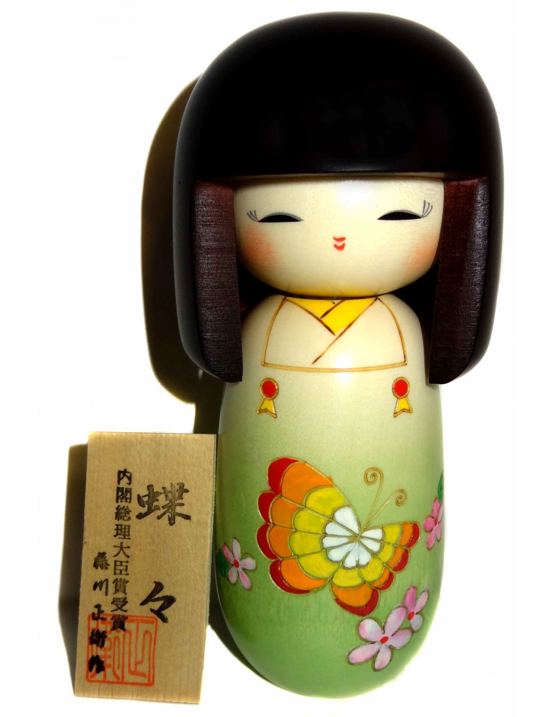 Très belle poupée Kokeshi portant un kimono vert, décoré de fleurs et d'un grand papillon.