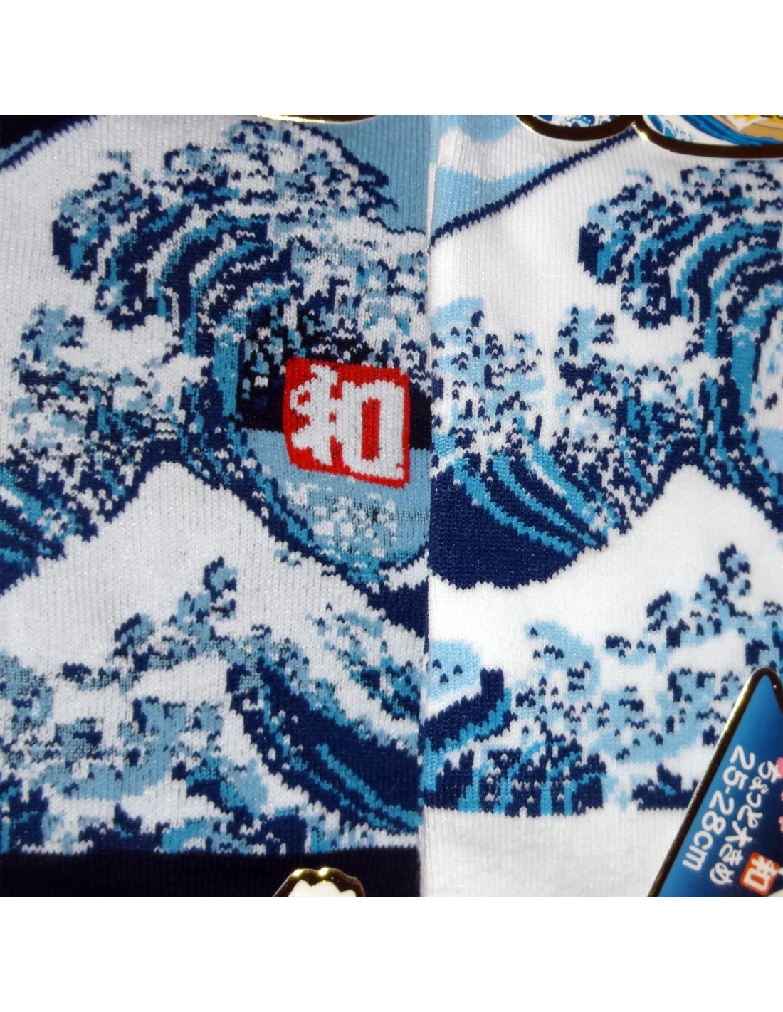Des chaussettes japonaises d'après " les trente-six vues du Mont Fuji " du maître d'estampes Katsuhika Hokusaï : la célébrissime "Grande vague vue de la côte de Kanagawa".